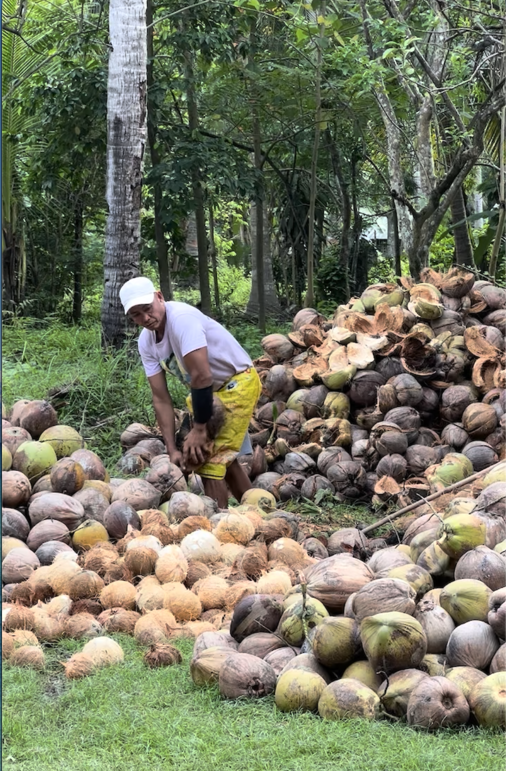 Inaani namin ang mga niyog minsan bawat tatlong buwan. Habang ang ilang manggagawa sa ibang bahagi ng bansa ay umaakyat sa puno ng niyog, ang pag-aani sa aming bayan ay nangangailangan ng paghila sa mga niyog mula sa puno gamit ang isang panungkit.