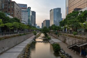 Cheonggyecheon stream at sunrise with trees (Source:Basile Morin, CC BY-SA 4.0 <https://creativecommons.org/licenses/by-sa/4.0>, via Wikimedia Commons